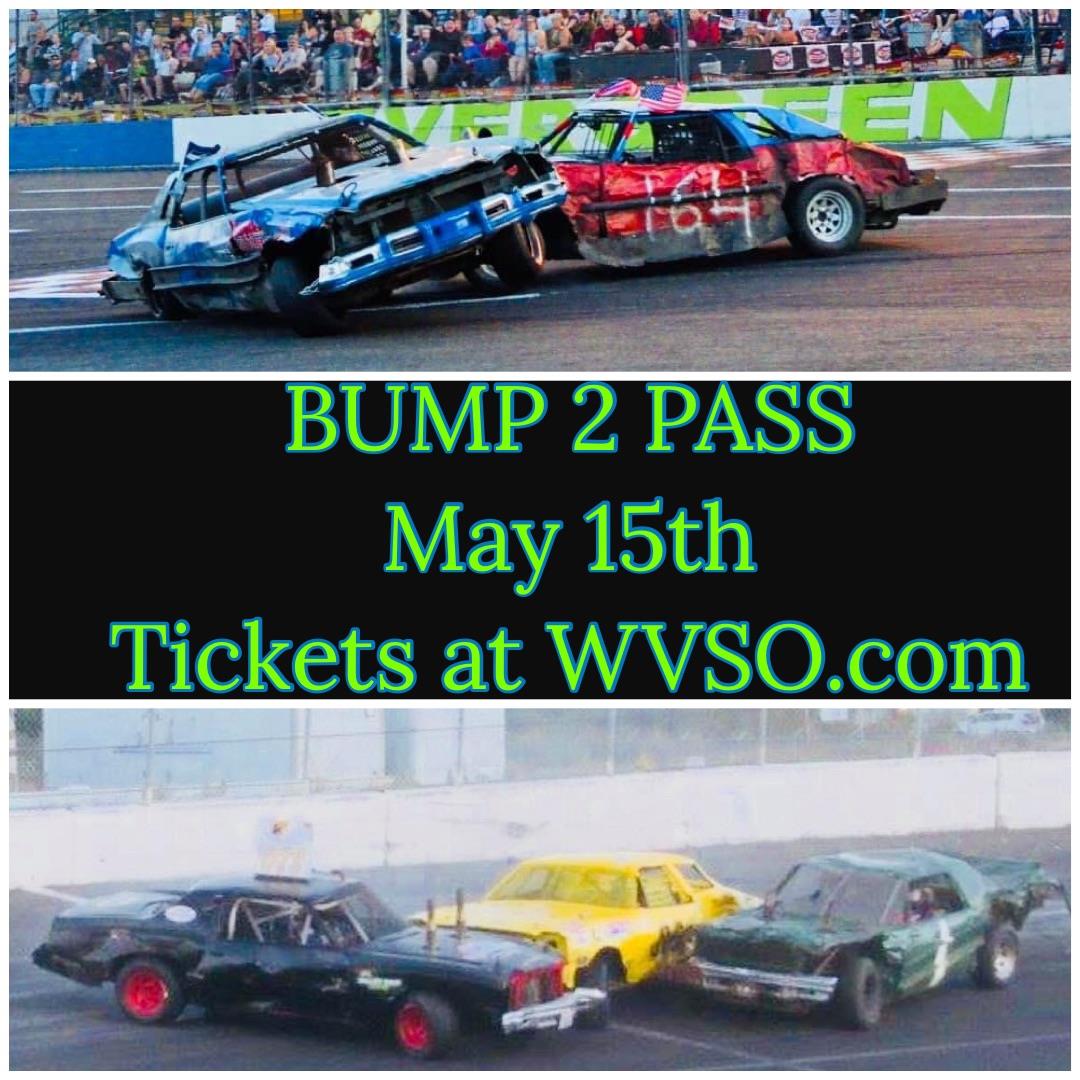 Don’t miss Bump 2 Pass at WVSO May 15th with a huge night of chaos and carnage. Tickets will be available up to 12pm on race day at wvso.com and on sale at the front gate when it opens at 4:30pm. Racing starts at 6pm.