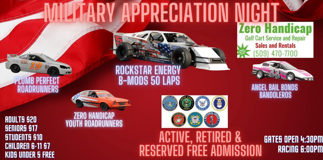 Wenatchee Valley's Super Oval is proud to once again host Military Appreciation Night Presented By Zero Handicap Golf Cart and Sales on Saturday May 20th. This night will be full of special things honoring our active, retired and reserved Military service men and woman. All Active, Retired & Reserved Military will receive Free Entry with Military ID. It will be a full night of racing with the Rockstar Energy B-Mods, Angels Bail Bonds Bandoleros, Plumb Perfect Roadrunners and the Zero Handicap Youth Roadrunners.