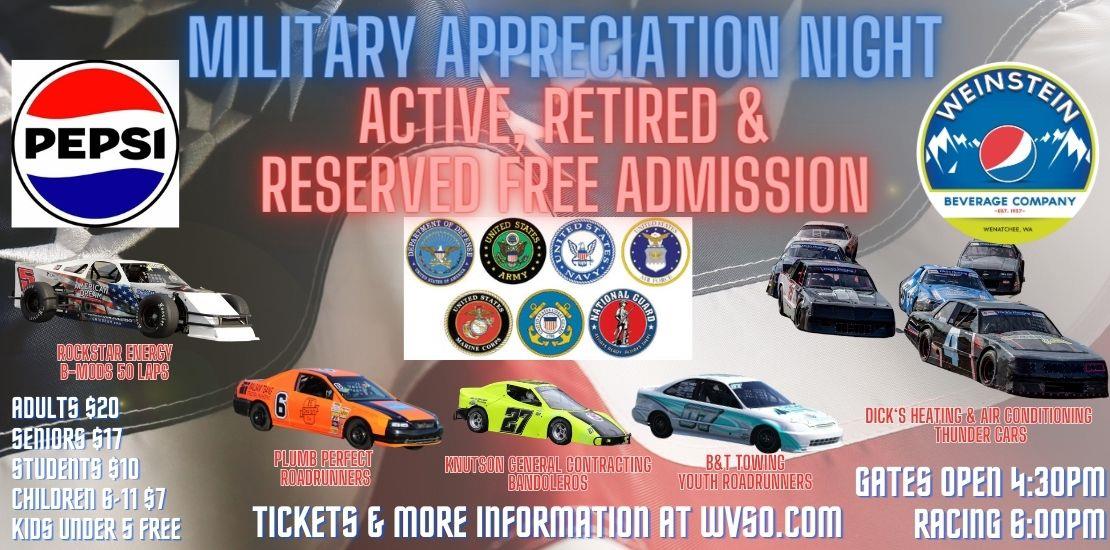 Our next event is a special one as it will be Military Appreciation Night Presented by Weinstein Beverage and Pepsi! All Active, Retired and Reserve Military get in FREE with Military ID. We will be honoring our Military throughout the night. It will be full night of racing with Rockstar Energy B-Mods, Dick's Heating & Air Conditioning of Wenatchee, Inc. Thunder Cars, Plumb Perfect Roadrunners, Knutson General Contracting Bandoleros and B & T Towing Youth Roadrunners.