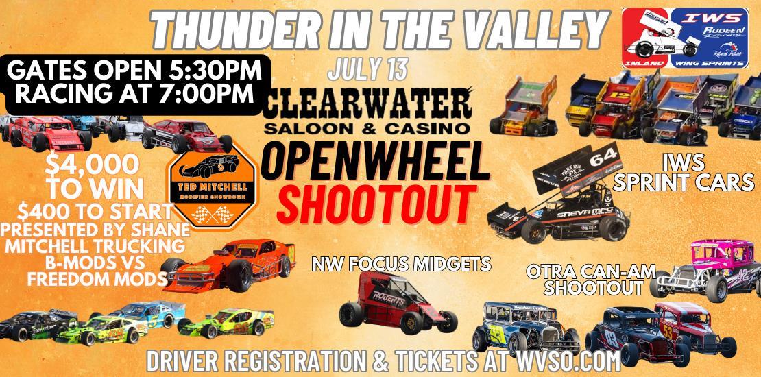 It’s one of the fastest, biggest and loudest weekends of the year for the 2024 Thunder in the Valley Presented by Clearwater Saloon & Casino Saturday July 13th! It will be the first ever $4,000 to win Ted Mitchell Modified Showdown Presented by Shane Mitchell Trucking as the B-Mods and NW Freedom Mods battle it out. For the first time in history the Inland wing sprints IWS Sprint Cars will visit Wenatchee! These cars will turn 10-11 second laps around the 1/4 mile. Than back for the first time in 5 years it’s the OTRA Can-Am Shootout as these old style B Cars from Canada, Washington, Oregon and Idaho will meet at WVSO. The always entertaining NW Focus Midgets Series are back for the second time this year!
