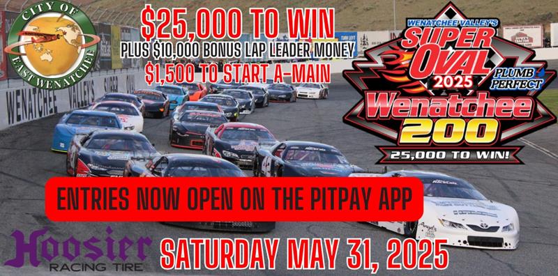 The return of the $25,000 to win Wenatchee 200 Presented Plumb Perfect brings one of the biggest races on the West Coast back to the fastest 1/4 mile in the west. Some of the biggest Super Late Models names in the business has marked this race on their schedule in 2024. The event features everything in one day with an optional Friday practice. They will be supported by Inex Legends and Dick's Heating & Air Conditioning Thunder Cars. Big thank you to the City of East Wenatchee and Hoosier Tire West for supporting this event.
